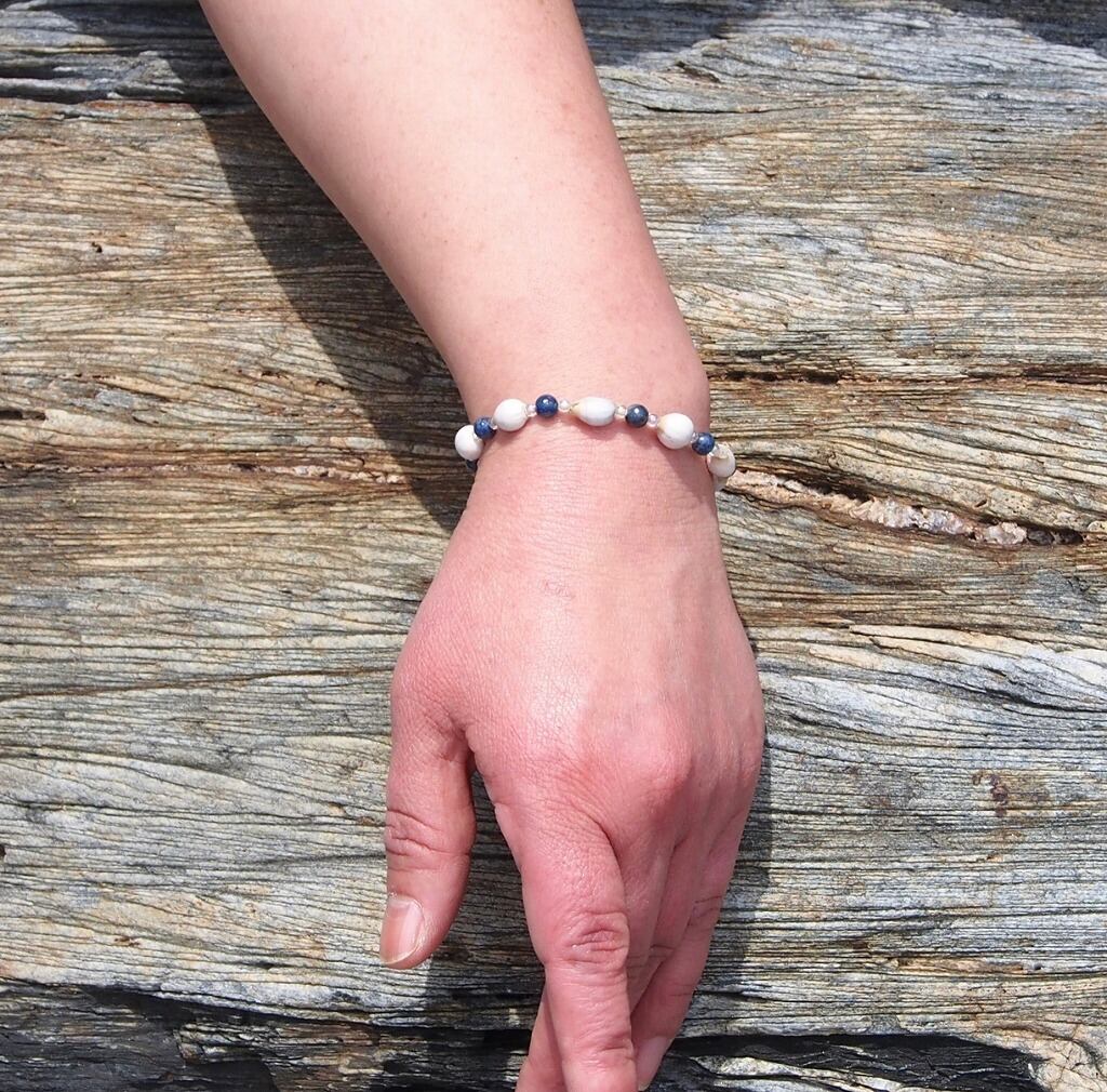 ほどんど採れない白いジュズダマと、瑠璃色のラピスラズリを組み合わせました。