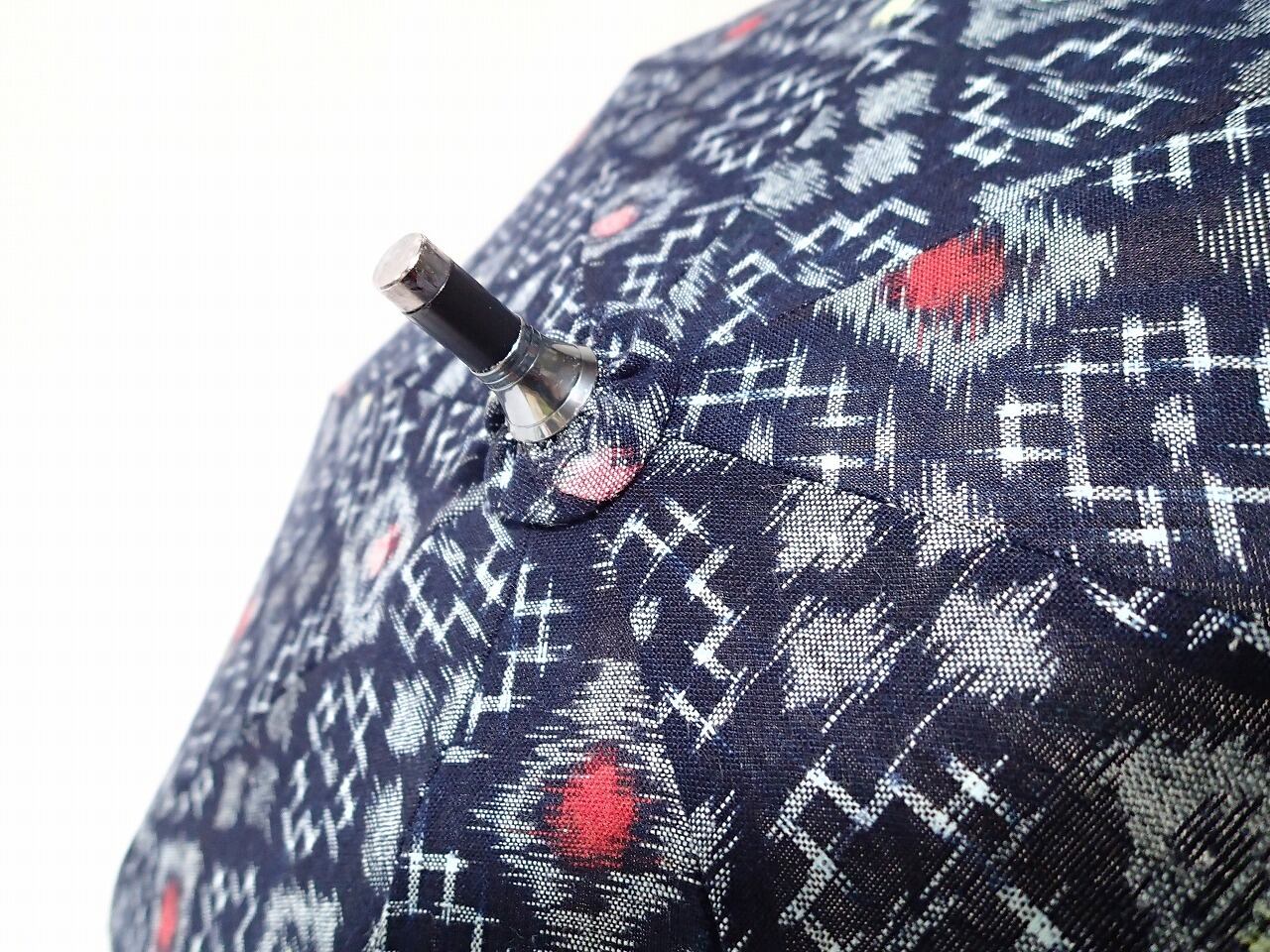 The parasol is made from Japanese antique Kurume kasuri Kimono fabric.