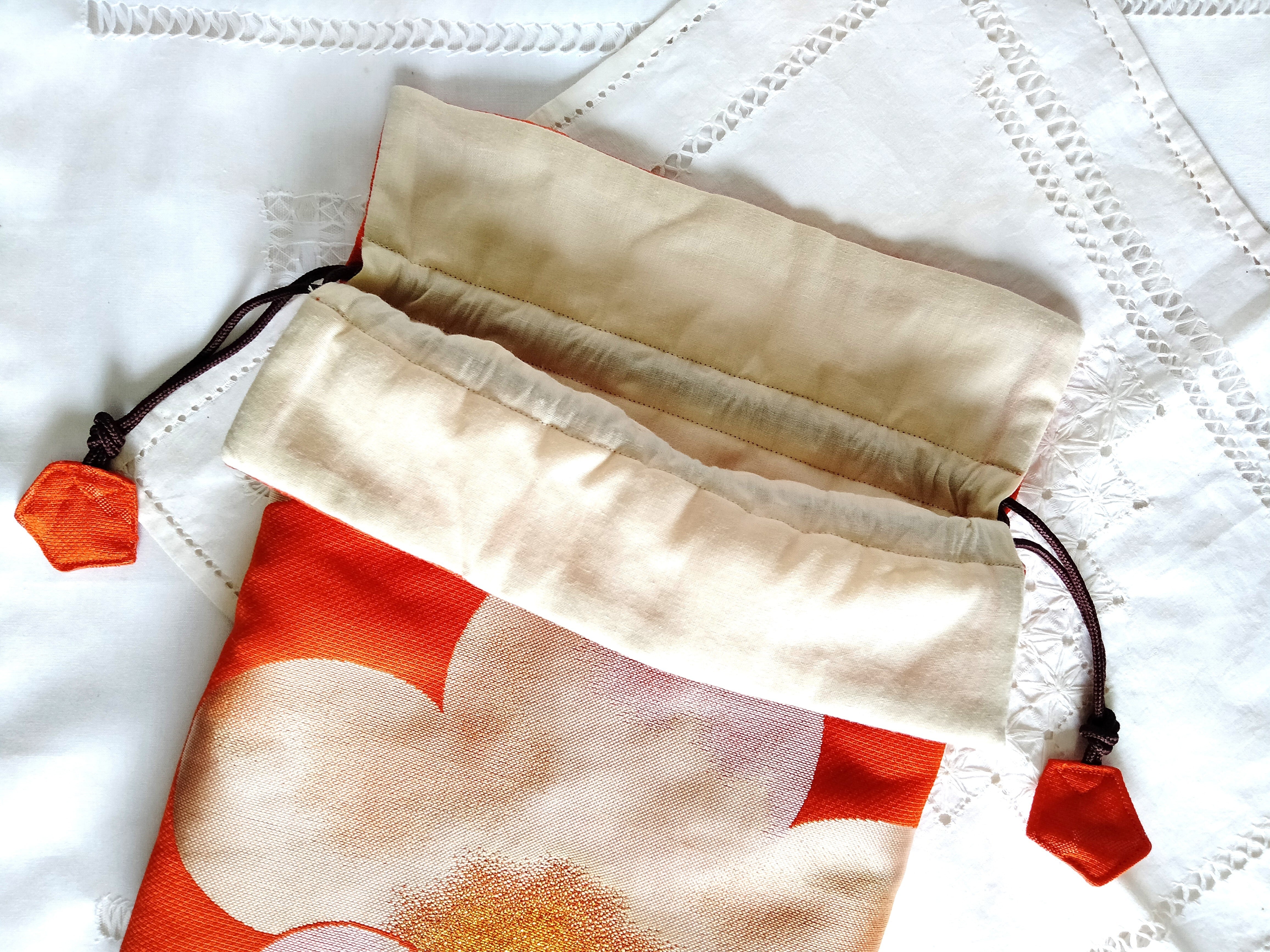 *アンティークの婚礼布団用反物を使用しています。シミやほつれの少ない部分を選んで製作しておりますが、多少の色の濃淡や目立たない小さなシミがあるかもしれません。 古布にご理解のあるかたのご購入をお願いいたします。